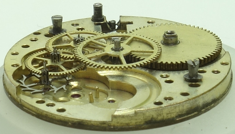 Das Räderwerk, das teilweise noch aus mit aus der Schweiz importierten Teilen bestand, ist ganz klassisch aufgebaut, mit zentralem, direkt vom Federhaus angetriebenem Minutenrad, gefolgt vom Kleinbodenrad, dezentralem Sekundenrad bei 6 Uhr und schließlich dem Stahl-Ankerrad.
