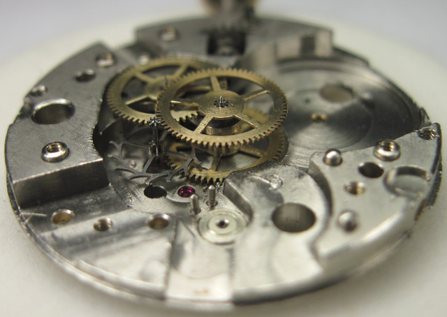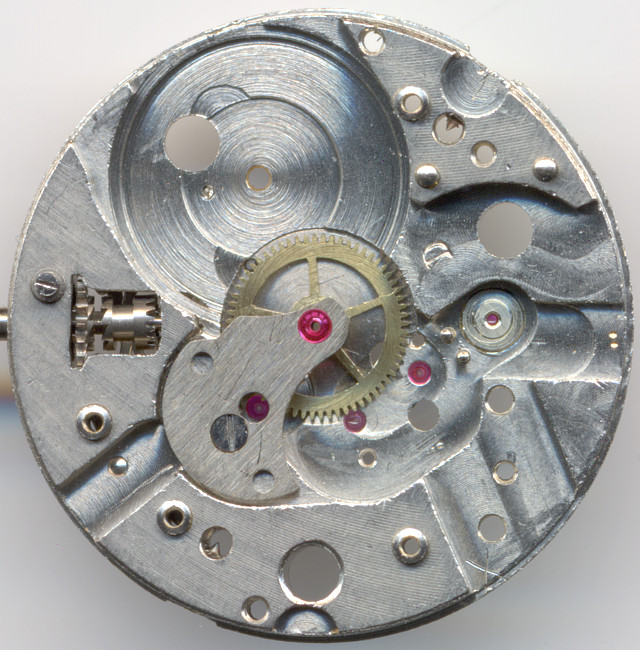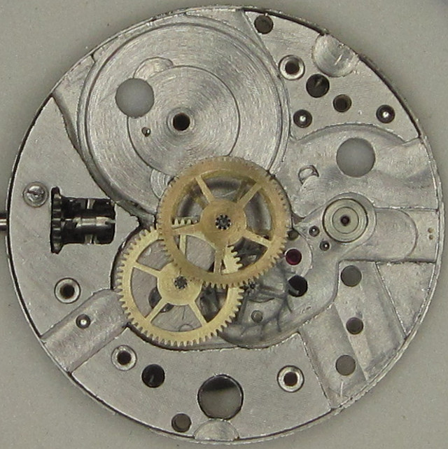 Die Grundplatine verrät den konservativen, damals gerne verwendeten Werksaufbau mit zentralem Minutenrad. Dieses ist beim Uwersi 57/10 sogar steingelagert!