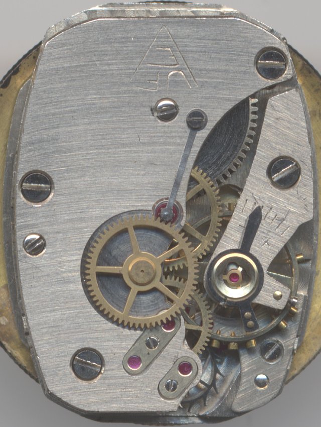 Nach dem Krieg waren Herren-Formwerke kurze Zeit recht aktuell. Zu dieser Sorte Werke gehört auch dieses, eher späte Exemplar, das Uwersi Kaliber 57/12, das extrem verschwenderisch mit synthetischen Rubinen umgeht. Ganze 25 davon wurden verbaut, ein Großteil davon allerdings nur in Form von Decksteinen, teilweise sogar dort, wo sich gar keine Zahnräder befinden (auf “7”).