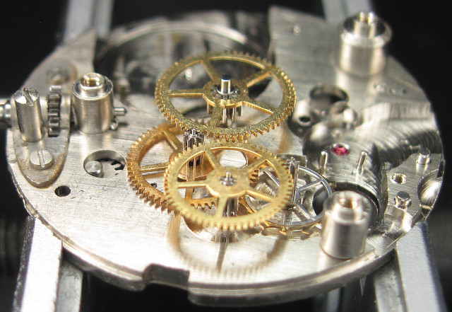 Das Räderwerk, dessen vier Räder alle unter der großen, einzigen Räderwerksbrücke gelagert sind, ist klassisch-konventionell aufgebaut, mit dezentraler Sekunde auf “6 Uhr” und direkt vom Federhaus angetriebener Minute.