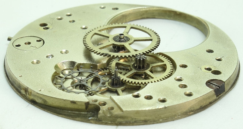 Das Räderwerk folgt dem üblichen Aufbau mit Federhaus, zentralem Minutenrad, Kleinbodenrad, Sekundenrad und Zylinderrad.