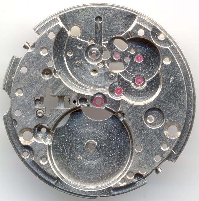 Die Grundplatine läßt erkennen, daß sämtliche Lager, mit Ausnahme des Federhauses, mit Steinen ausgestattet sind.