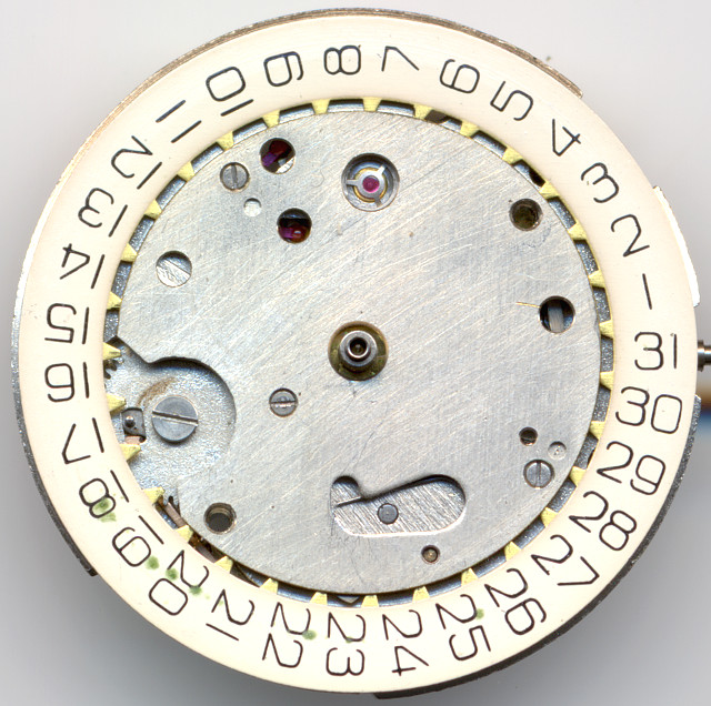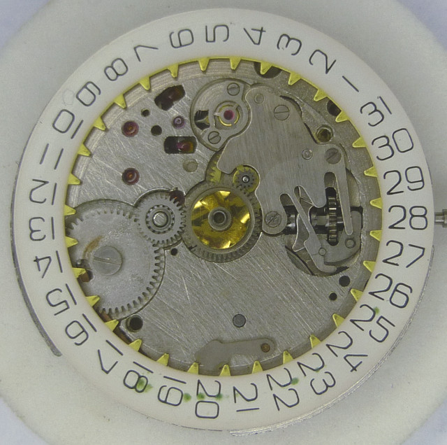 Der Datumsmechanismus arbeitet mit einen Schaltrad (bei 8 Uhr), das einen darunterliegenden beweglichen Schaltnocken besitzt. Dieser ist zum Einen dafür verantwortlich, daß das Datum schlagartig umspring, zum Anderen, daß es halbschnell durch Zurück- und Vordrehen der Uhrzeit korrigiert werden kann.