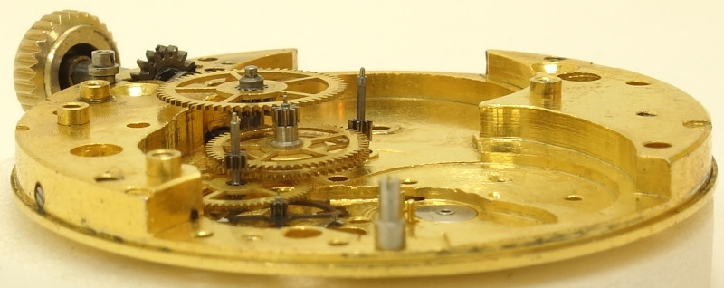 Das Federhaus wirkt auf das außermittig liegende Großbodenrad ein, gefolgt von einem doppelten Kleinbodenrad, Sekundenrad und Ankerrad.