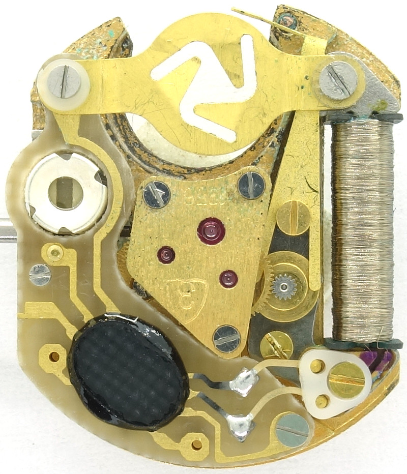 Das Elektronikmodul des Zaria 1956 kommt mit nur drei Bauteilen aus, dem gebondeten Chip auf der Oberseite, dem kleinen Stimmgabelquarz auf der Unterseite und einem Trimmkondensator. Außerdem gibt es einen Stopp-Pin, der kurzgeschlossen wird, wenn die Krone gezogen wird, und so zusätzlich zum mechanischen Stopp auch elektronisch eine Stoppfunktion bietet.