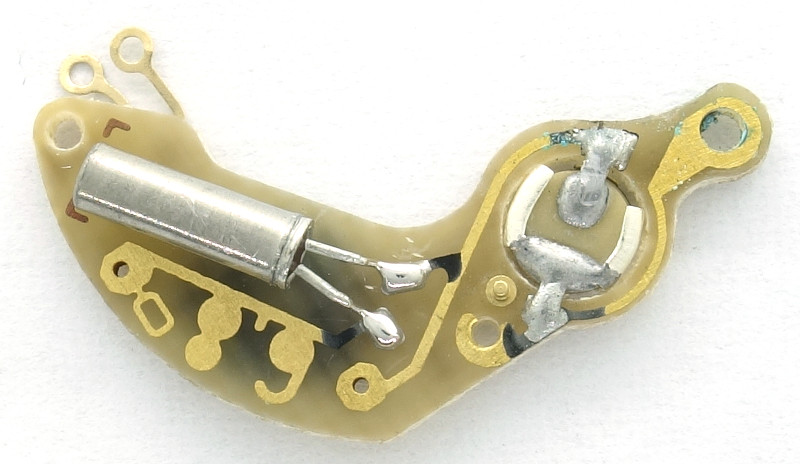 Die Spule des Lavet-Schrittmotors wird mit Hilfe zweier Kontaktplättchen mit Dorn angeschlossen.