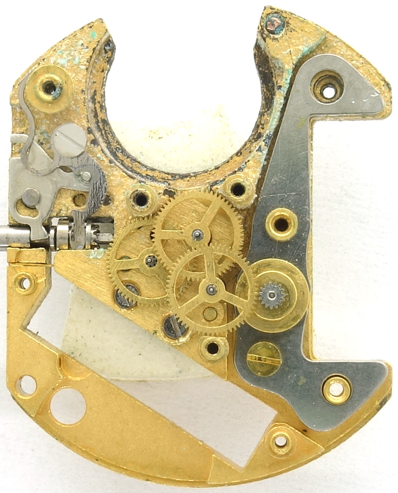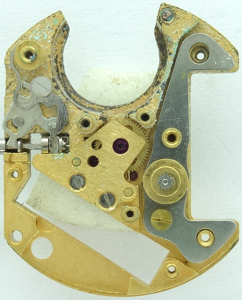 Das Räderwerk selber ist relativ typisch für ein Quarzwerk: Auf den Rotor des Lavet-Schrittmotors folgt ein Übersetzungsrad, gefolgt vom zentralen Sekundenrad, Kleinbodenrad und zentralem Minutenrad.