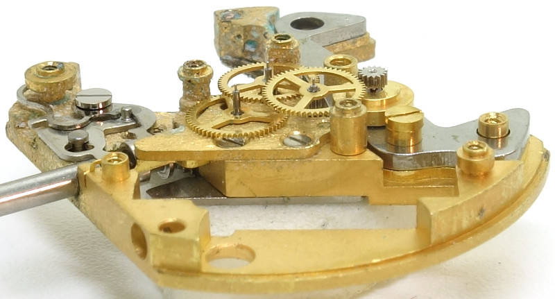 Sämtliche Lager waren hier noch mit Steinen ausgekleidet, sogar die Lager des zentralen Minutenrads, in Summe somit acht Steine.