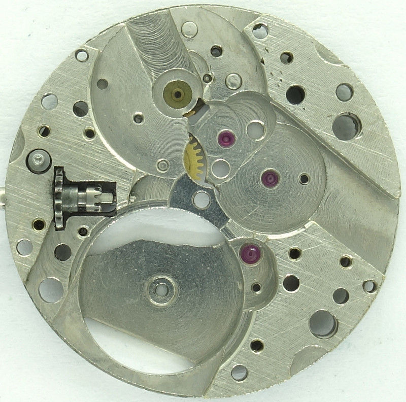 Auf der Zifferblattseite erkennt man neben dem auffälligen Stoßsicherungslager zwei Decksteine für Anker- und Kleinbodenrad. Damit konnte die für die Vermarktung wichtige Zahl von 17 Steinen erreicht werden.