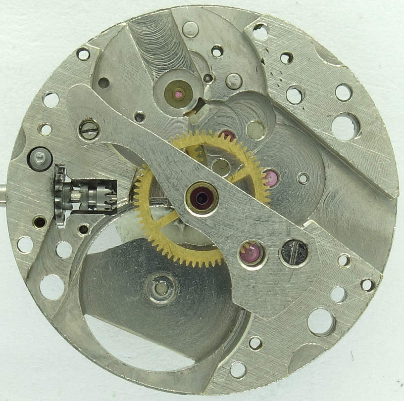 Ansonsten wäre noch der Kupplungsaufzug erwähnen, mit seiner charakteristisch geformten Winkelhebelfeder und dem Kupplungshebel, der mit einer Schraube das Kupplungstrieb führt.