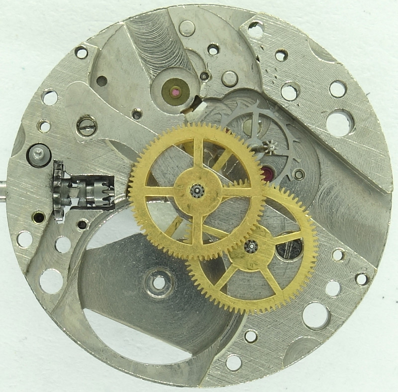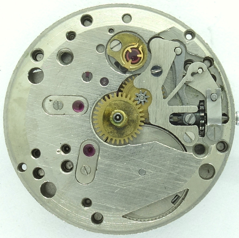 Als Unruh kommt eine goldfarbige, zweischenklige, vermutlich Glucydur-Ringunruh zum Einsatz, die noch gemächlich mit 18000 Halbschwingungen pro Stunde arbeitet.