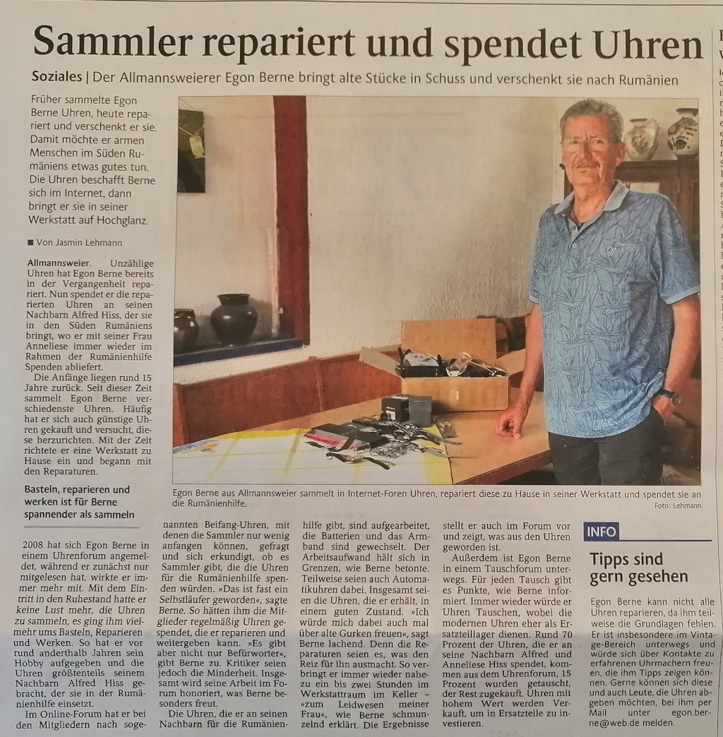 Dieses Projekt, das im Uhr-Forum seinen Ursprung hat, besteht darin, noch brauchbare Uhren zu sammen, aufzubereiten und als Spende nach Rumänien zu schicken, wo sie mehr als dankbar aufgenommen werden. Bis Januar 2024 konnten auf diese Weise fast 2500 Uhren neue Besitzerinnen und Besitzer finden, und es geht immer weiter.
